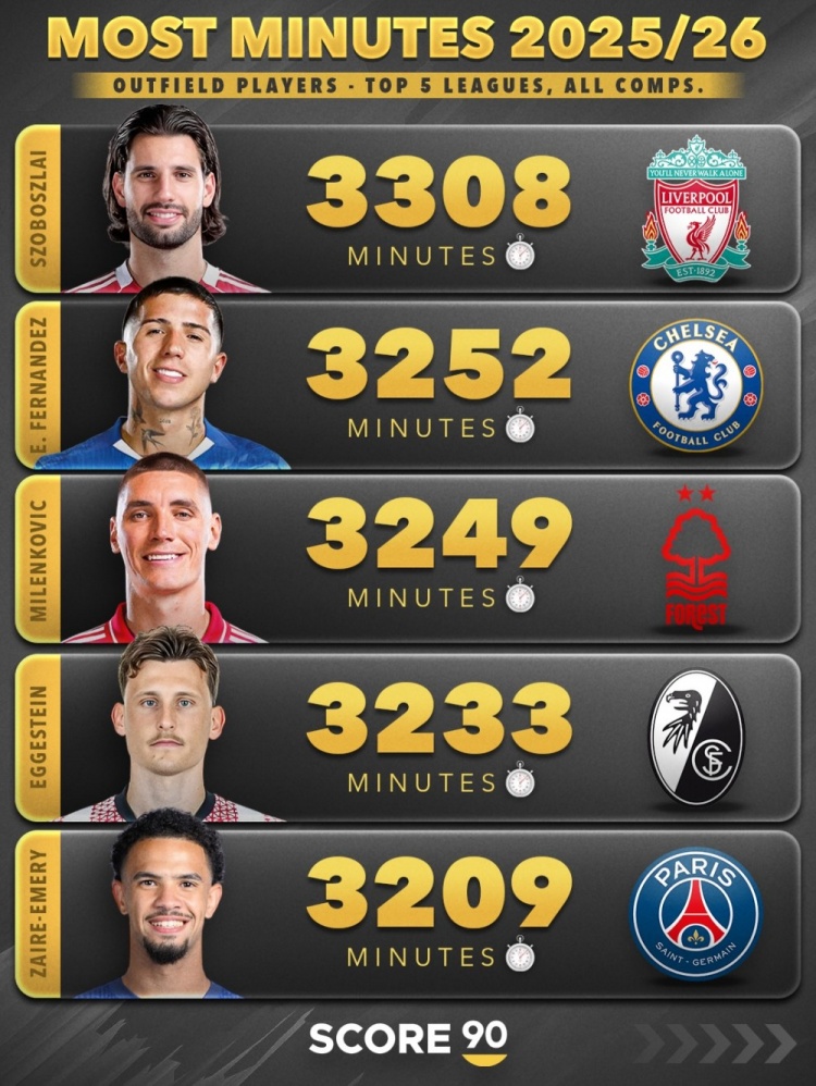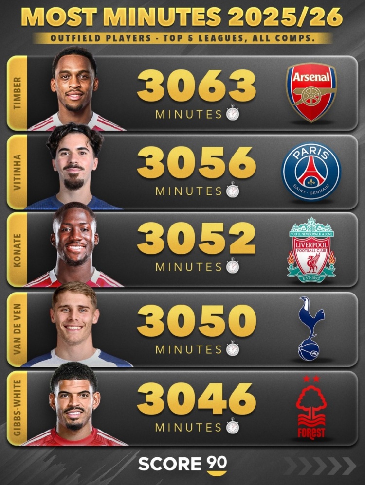 奇异果官网-本赛季五大联赛非门将球员出场时间榜:范戴克3510分钟第三