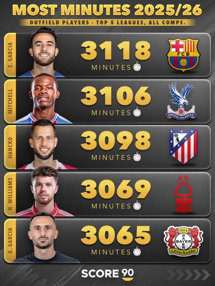 3月3日讯 Score90统计出了本赛季五大联赛迄今为止,各项赛事出战比赛时间最多的30名非门将球员,水晶宫的拉克鲁瓦以3540分钟居首,利物浦队长范戴克以3510分钟位居第三。